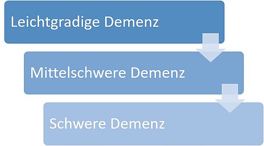 Die geläufige Verlaufsbeschreibung orientiert sich an der Alzheimer-Erkrankung. Demnach durchläuft eine Demenz drei Stadien.