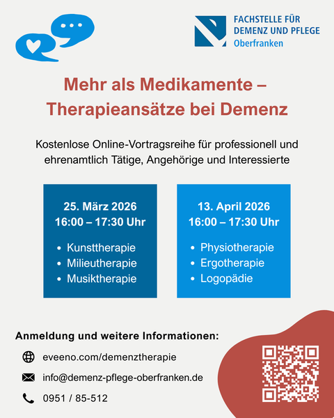 | Beschreibung | Am Mittwoch, 25. März und Montag, 13. April 2026 von 16:00 bis 17:30 Uhr bietet die Fachstelle für Demenz und Pflege Oberfranken eine kostenfreie Online-Vortragsreihe an, die sich mit wirksamen therapeutischen Ansätzen in der Begleitung von Menschen mit Demenz beschäftigt. Die Vortragsreihe richtet sich an pflegende Angehörige, ehrenamtlich und professionell Tätige sowie an alle interessierten Bürgerinnen und Bürger, die Menschen mit Demenz im privaten oder beruflichen Umfeld begleiten. Im Fokus stehen bewährte Therapieformen, die über medikamentöse Behandlungen hinausgehen, die Lebensqualität fördern und vorhandene Fähigkeiten von Menschen mit Demenz stärken. Am 25. März 2026 geht es um folgende Therapiemöglichkeiten: