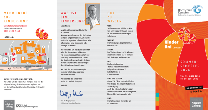 Wer? Schülerinnen und Schüler im Alter von acht bis zwölf Jahren Wann? 16. April 2026 um 16 Uhr (Dauer ca. 45 Minuten) Wo? Hochschule Kempten, Thomas-Dachser-Auditorium, Erdgeschoss, Gebäude V, Bahnhofstraße 61, 87435 Kempten Und die Eltern? Ganze 350 Plätze stehen im Kinder-Uni-Hörsaal den jungen Studierenden zur Verfügung. Auch Eltern, Großeltern und andere Erwachsene, die dich begleiten, können hier hautnah dabei sein.