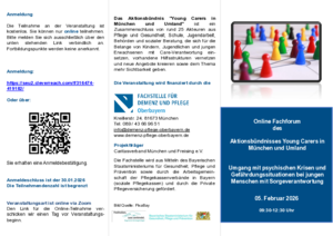 | Titel der Veranstaltung | Online Fachforum des Aktionsbündnisses Young Carers in München und Umland: Umgang mit psychischen Krisen und Gefährdungssituationen bei jungen Menschen mit Sorgeverantwortung |